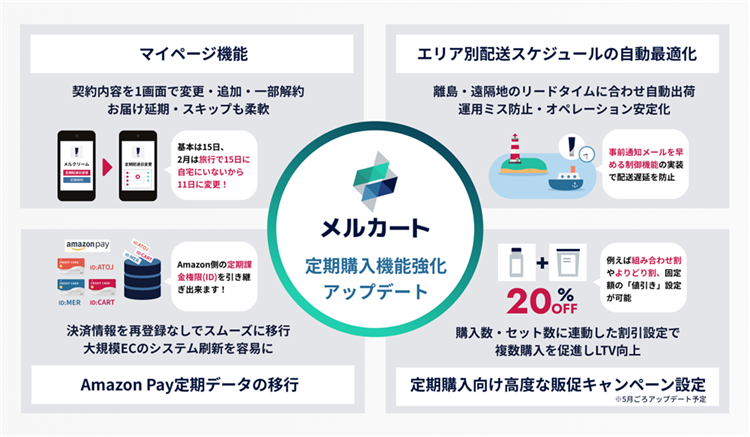 株式会社メルカート(本社:東京都港区、代表取締役社長:渡邉 章公/以下、メルカート)は、提供するクラウドEC構築プラットフォーム「メルカート」の定期購入(サブスクリプション)機能を大幅に強化するアップデートを実施します。本アップデートでは、事業者様の運用負荷を軽減する「配送リードタイムの自動最適化」や、顧客自身がマイページで契約内容を柔軟に変更できる新機能を実装。現場のオペレーションミスを防ぎながら、顧客満足度を高めて解約を防止する、攻めのリピート戦略を支援します。